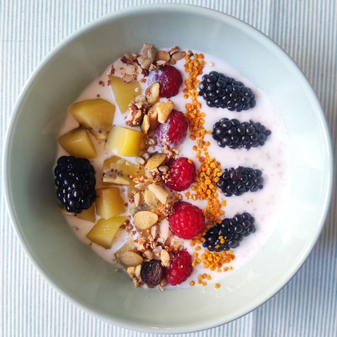 - En un tazón, vierte el kefir natural.