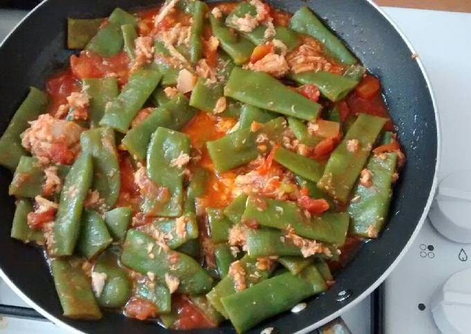 - Mezclar todo: añadir las judías verdes blanqueadas a la salsa de tomate y atún. Mezclar bien.