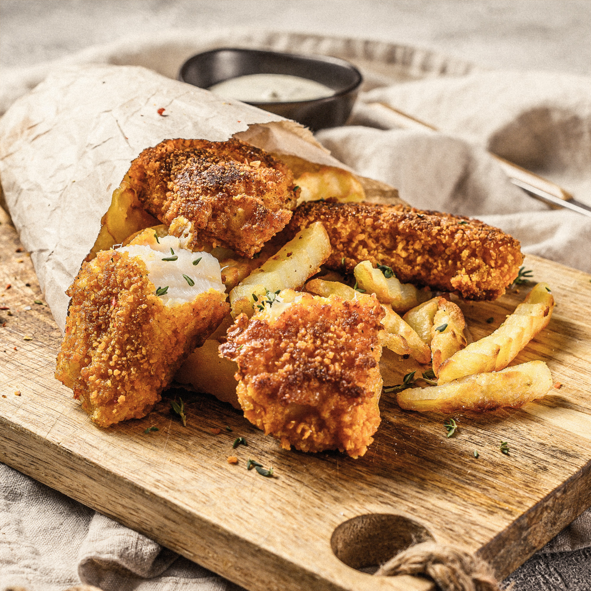Añade unas patatas cortadas en gajos a la cesta de la freidora junto con la merluza. Asegúrate de que las patatas estén bien sazonadas y espolvorea un poco de pimentón para un toque extra de sabor.