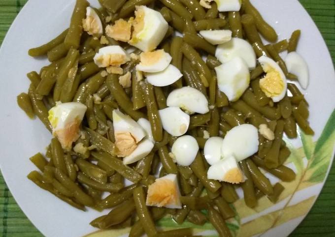 1. Mezclar las habichuelas verdes, los huevos duros y la cebolla frita.